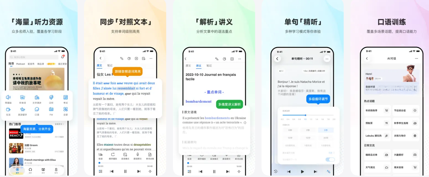 【每天更新的海量听力库】 - 每天为您推送RFI, TV5 等法语媒体最新的听力资源 - 每周为您推送由专人编辑整理的法语学习资源 - 收录法语区热门播客,跟随本土人士聆听地道内容 - 收入海量日常会话训练、名人演讲资源 - 独家支持语音高亮跟随功能